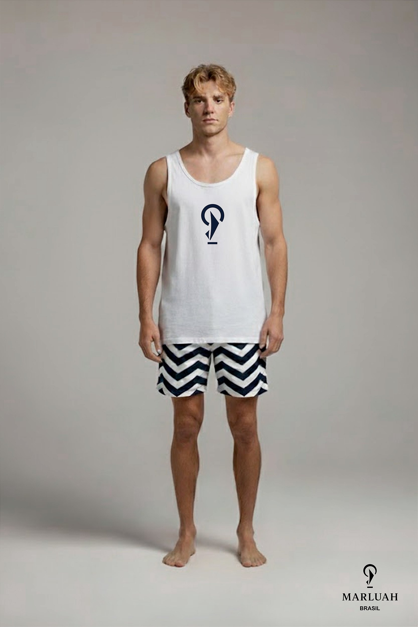 Perfeita para compor looks descontraídos com shorts de linho ou bermudas de banho, a regata é uma escolha versátil que combina conforto, estilo e autenticidade — do deck à praia, onde quer que o vento leve.