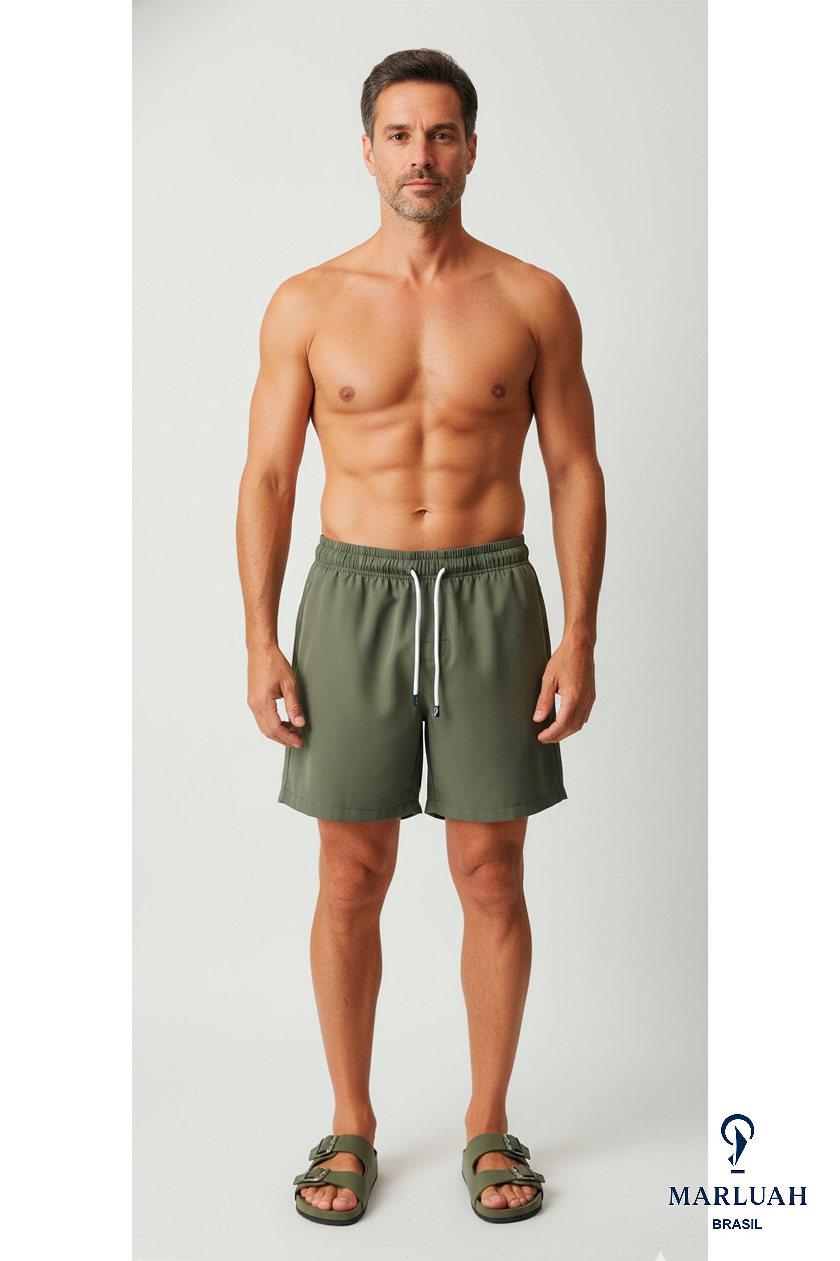 A tonalidade verde militar suave foi cuidadosamente escolhida para harmonizar com as cores náuticas da coleção — areia, branco e azul-marinho —, criando um visual natural e sofisticado, perfeito para quem vive o estilo náutico com autenticidade.